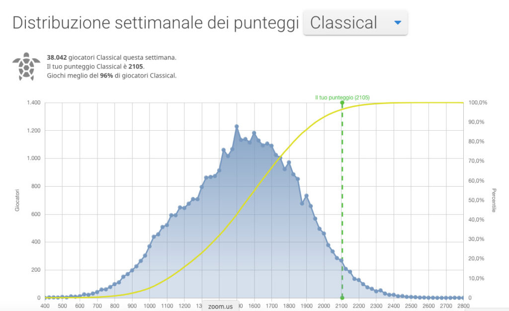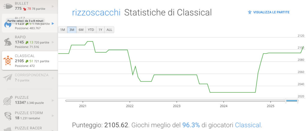 Il 3 agosto 2025 ho superato i 2100 punti nella piattaforma lichess.org giocando on-line per quel che riguarda le partite “Classical” (a tempo lungo) posizionandomi al n. 474 del mondo su un totale di quasi 40.000 giocatori.